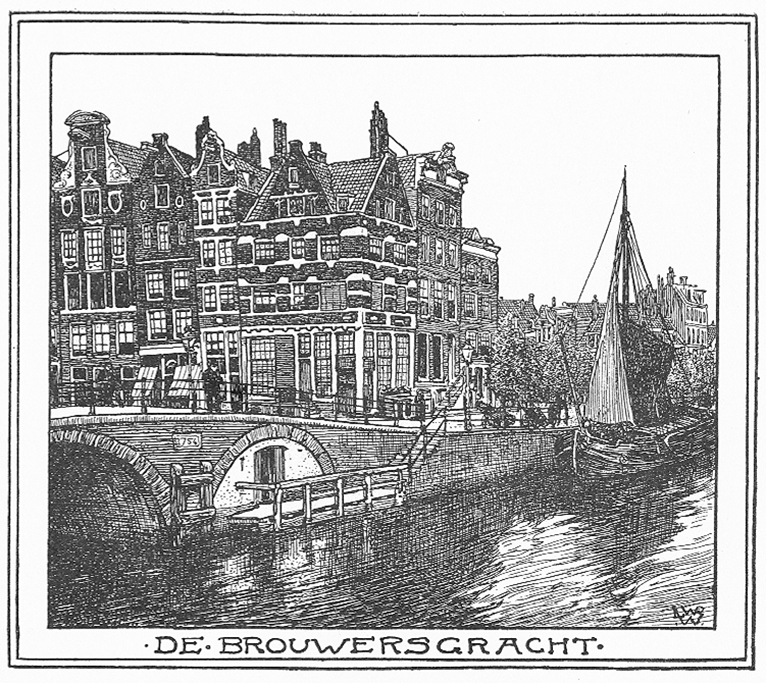 De Brouwersgracht - hier genomen met den hoek van de buitenzijde der Prinsengracht - is bij de aanmerkeljjke vergrooting van de stad in 1613 aangelegd als een vervolg op de reeds sinds 1595 bestaande Brouwersgracht tusschen Singel en Heerengracht. Het destIjds nieuwe gedeelte werd echter aanmerkelijk breeder genomen dan het tot dusver bestaande; en wie zich plaatst op de hooge brug aan bet begin der Heerengracht en dan beurteling rechts en links de twee Brouwersgrachten beschouwt, ziet terstond het groote verschil in aanleg tusschen de l6e en l7e eeuwsche stadvergrootingen.