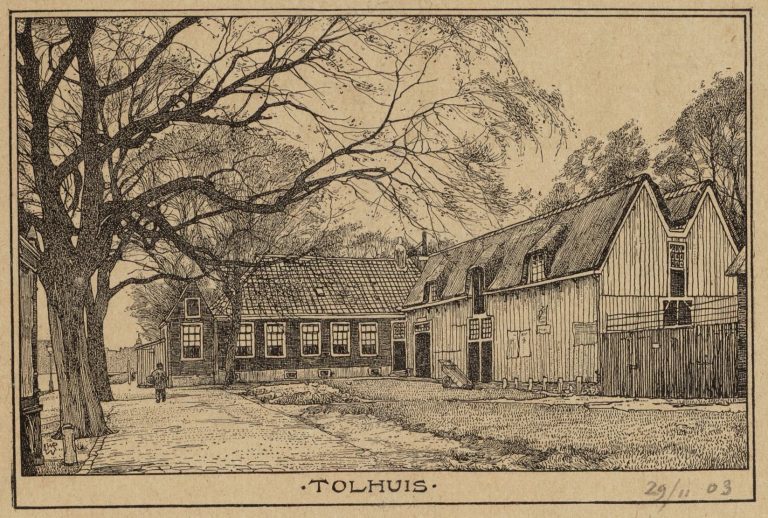 Een Amsterdammer, die van "het Tolhuis" spreekt. denkt daarbij gewoonlijk aan het gebouw met tuin, waar des zomers de bekende concerten worden gegeven. Toch is dit eigenlijk niet het tolhuis zelf; het voormalige tolhuis is in werkelijkheid het kleine huisje aan den weg, hetwelk men hier links aanschouwt, komende van den weg naar de sluizen. Natuurlijk heeft het sinds jaren zijne vroegere beteekenis als zoodanig verloren.