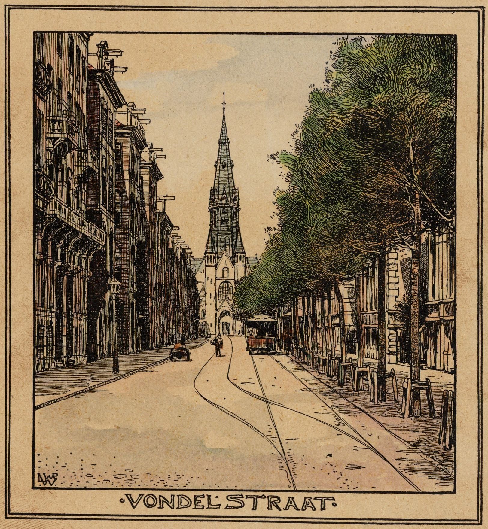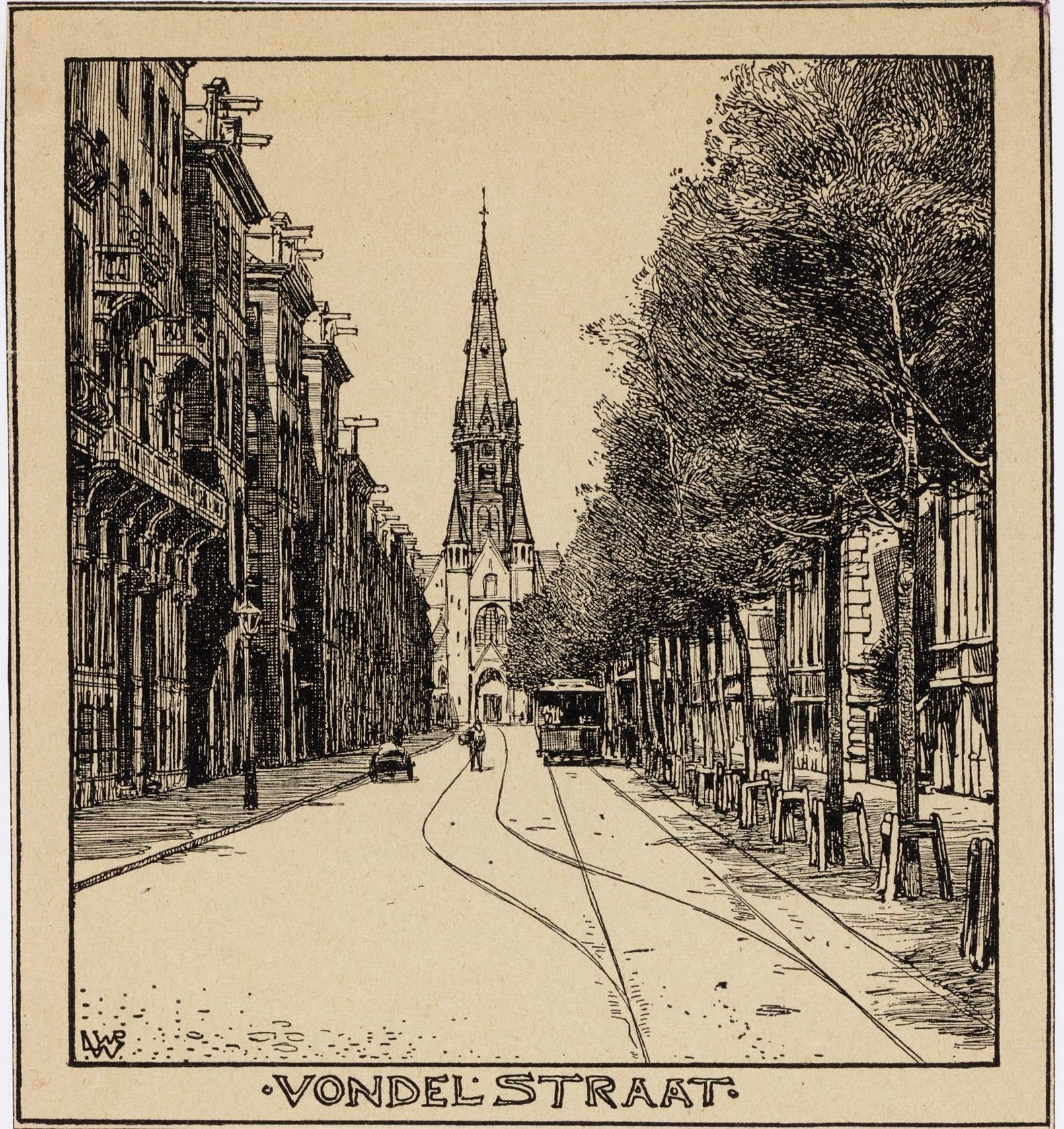 Beschrijving: Met zicht op de Vondelkerk en paardentram.