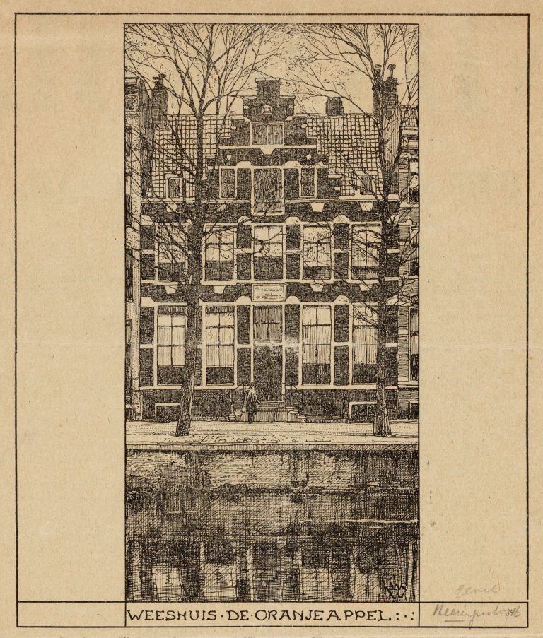 Dat Weeshuis, aanvankelijk niet uitsluitend voor kinderen van Doopsgezinden maar ook voor die van andere Protestanten bestemd, werd weldra te klein, zoodat de Regenten reeds in 1680 besloten tot den aankoop van het huis op de Heerengracht, dat thans den naam "Oranje-Appel" in den gevel draagt welke zoo wel op de Keizersgracht als in de Huidenstraat ook boven een poortje geplaatst is: Tegenwoordig worden hier ongeveer tusschen de 40 en 50 weezen opgevoed.